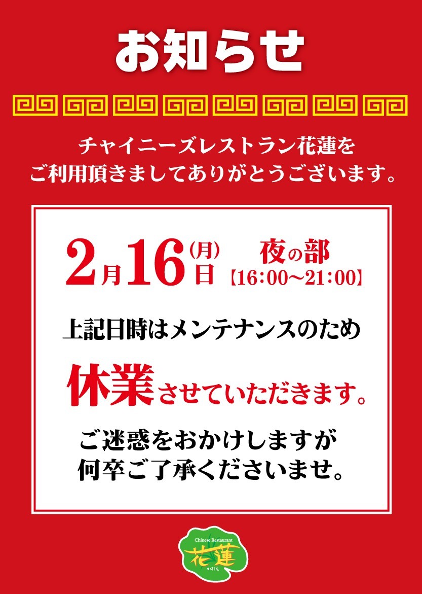 【2/16夜】臨時休業のお知らせ
