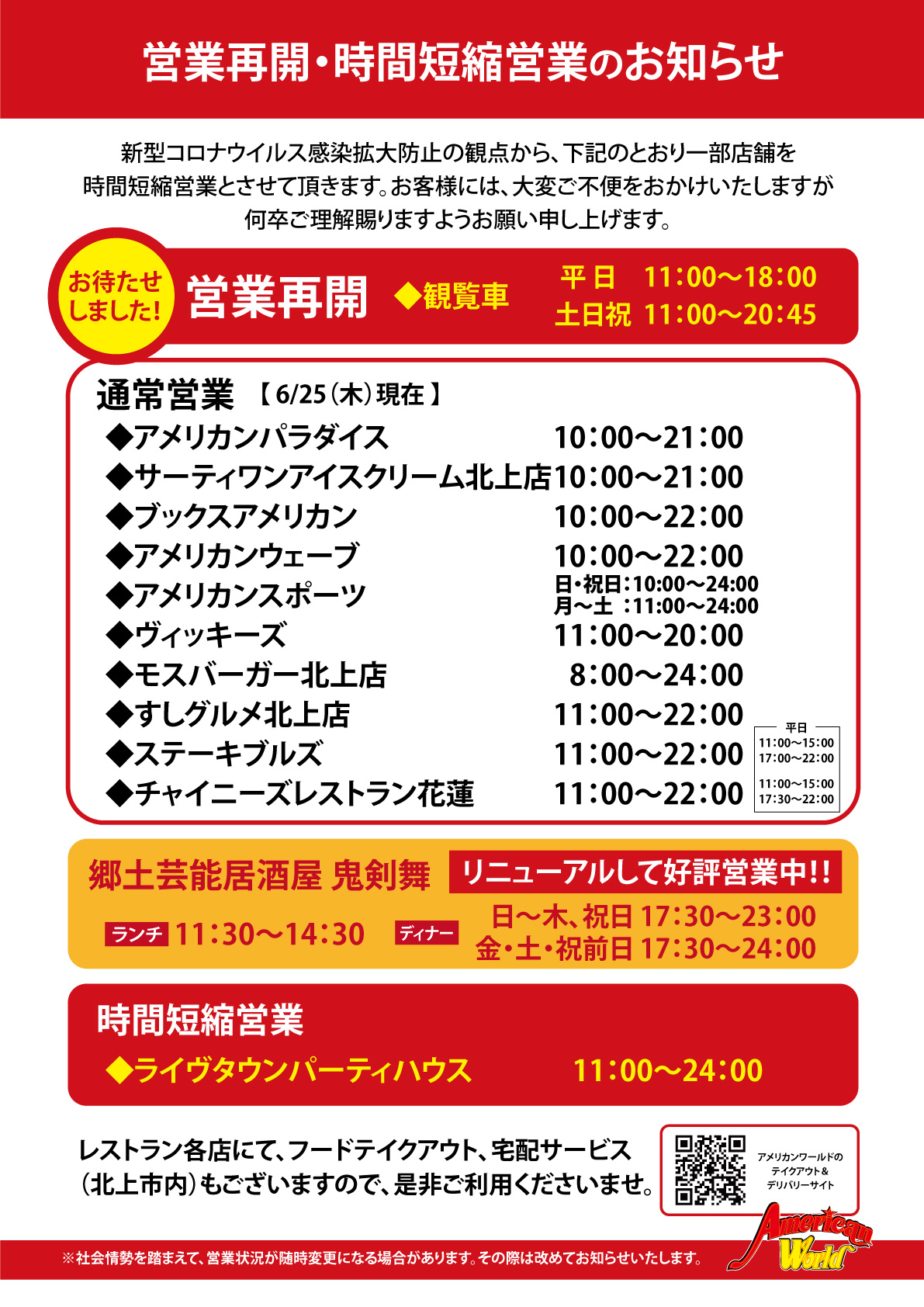 営業再開・臨時休業・時間短縮営業のお知らせ